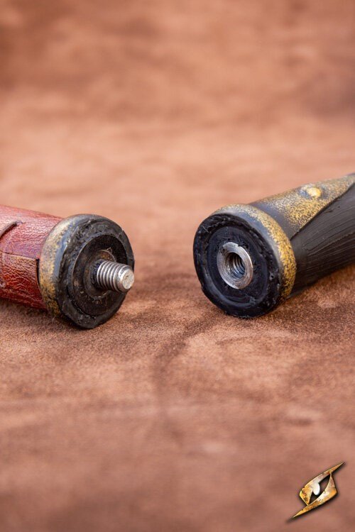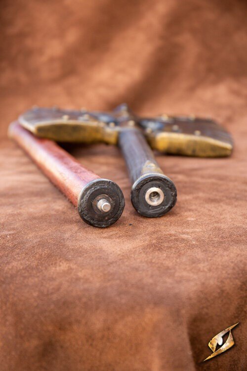 The new Compact, Double Headed Chaos Axe is the perfect Larp weapon for characters with limited space. This large two-handed battle-axe has two enormous blades whose edges are riddled with notches along its edges due to its many triumphant campaigns. Its two broad axe heads are made of steel and fastened to the shaft with antique brass accents. The long blood-red leather grip is hand-stitched, making the latex weapon easy to wield by any barbarian. This Larp weapon is perfectly safe for combat, and this giant battle-axe comes with a detachable head making it as unique as it is deadly as well as easy to transport to your game.
