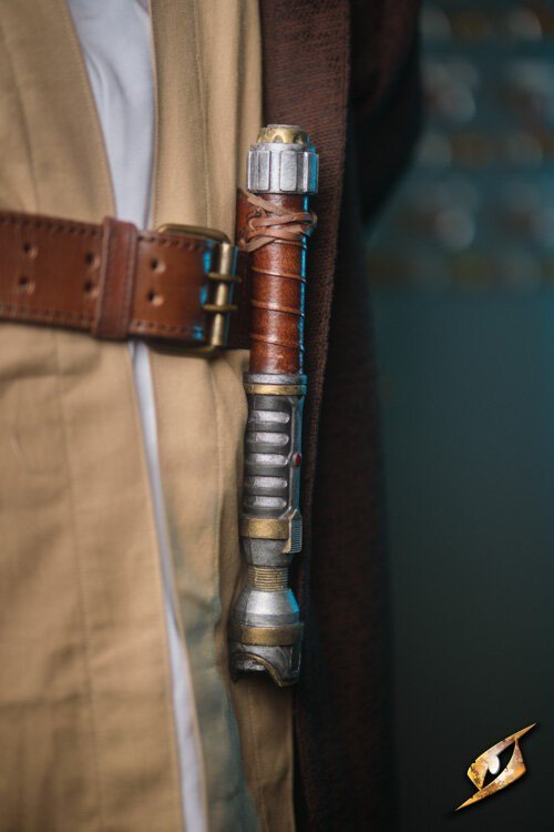The blade, crafted from ethylene-vinyl acetate (EVA) foam, surrounds a strong fibreglass core to provide both flexibility and durability. The handle, made from high-quality polyurethane (PU) foam, is partly wrapped in leather, offering comfort and a secure grip for long duels or galactic escapades.