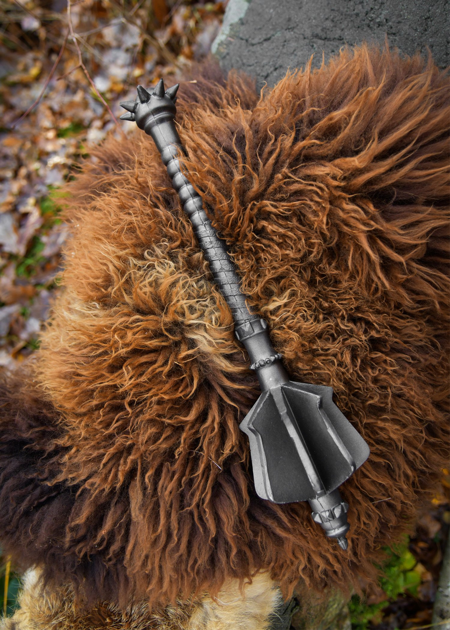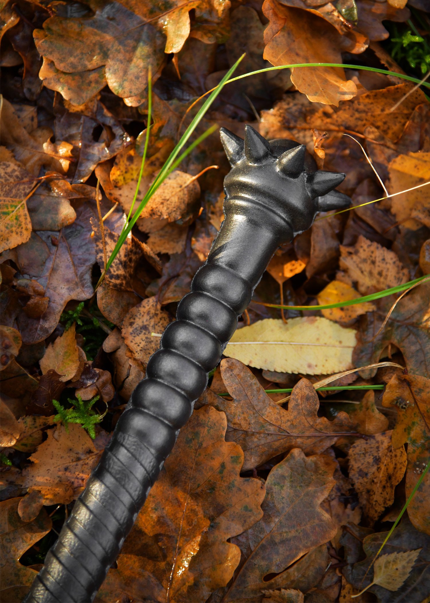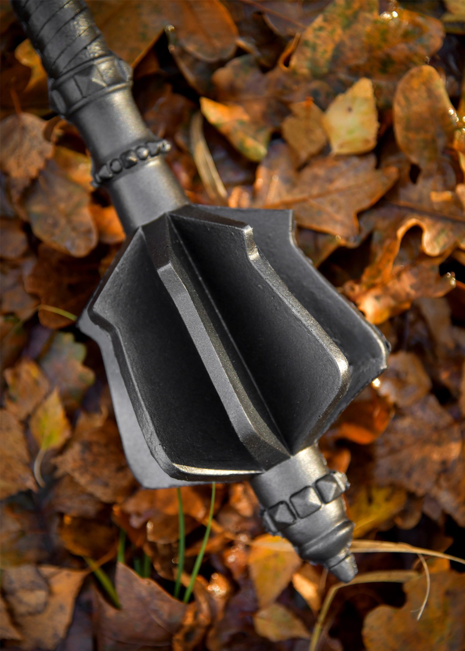 The mace is crafted from high-quality polyurethane foam and is fully blackened. Broad, striking surfaces and stylised rivets give it a menacing appearance. The grip is intricately detailed and ensures a firm hold even in extended battles. The pommel at the base is adorned with pointed rivets, stylishly rounding off Malrik’s fierce and battle-ready design.