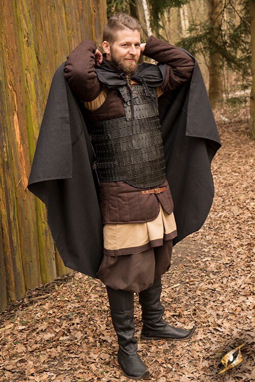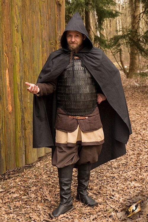 This Ready-for-Battle Cape is an advanced semi-circular cape: short at the flanks, long at the back, and fitted with a hood with cotton-strap fastenings. This design combines ease of movement with the best degree of protection from the elements. Made from durable cotton, this cape is easily made water resistant with a treatment at home.