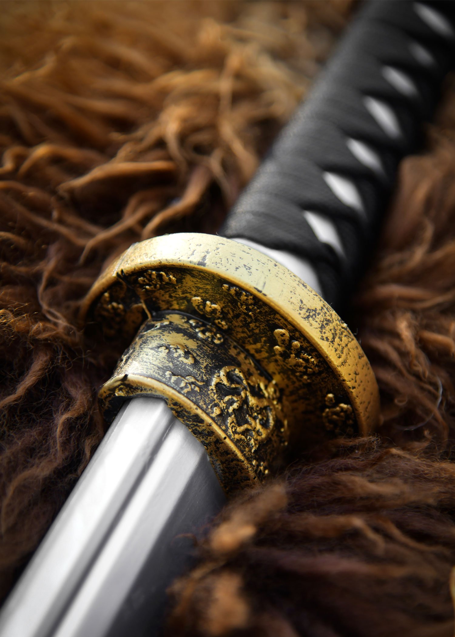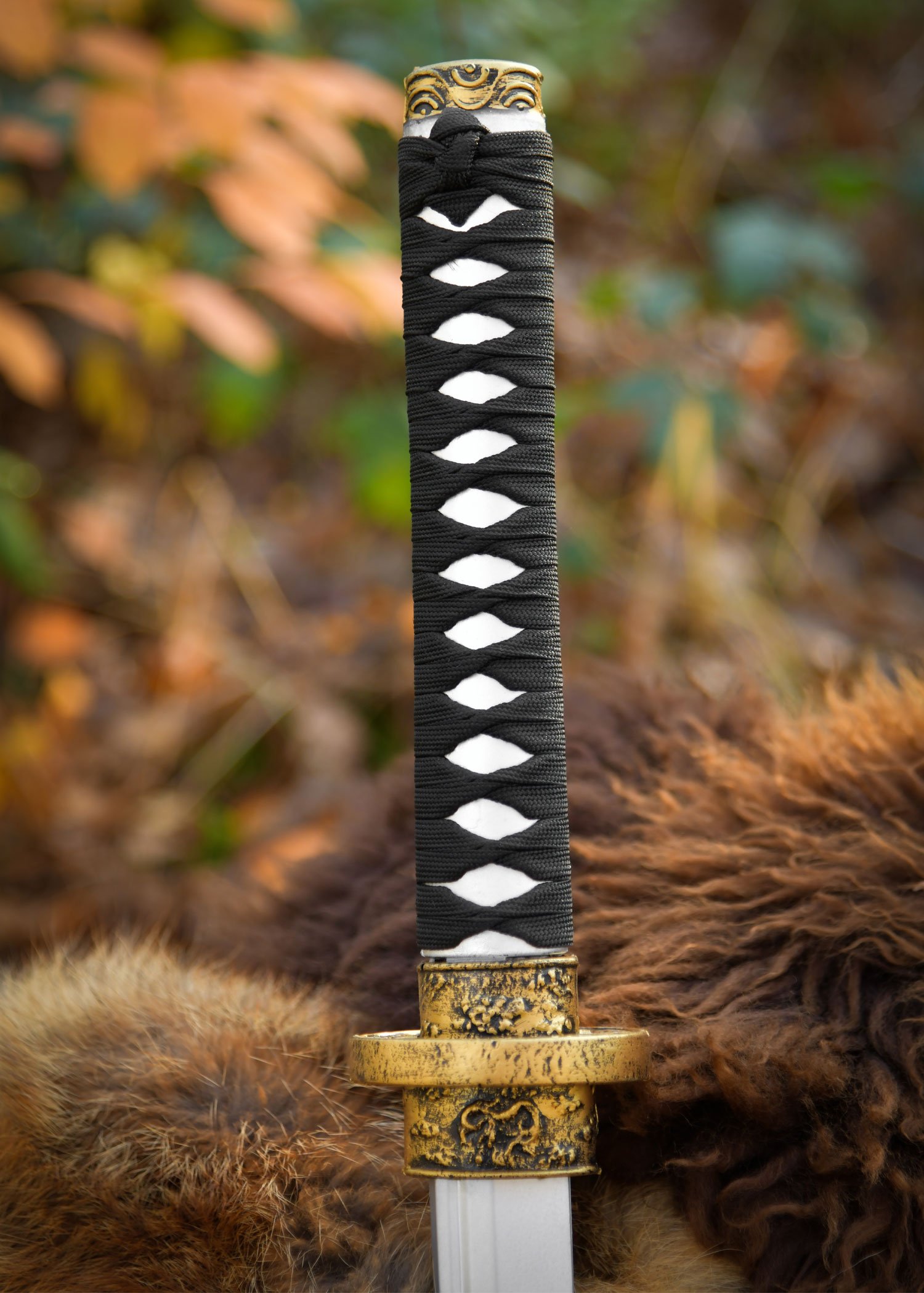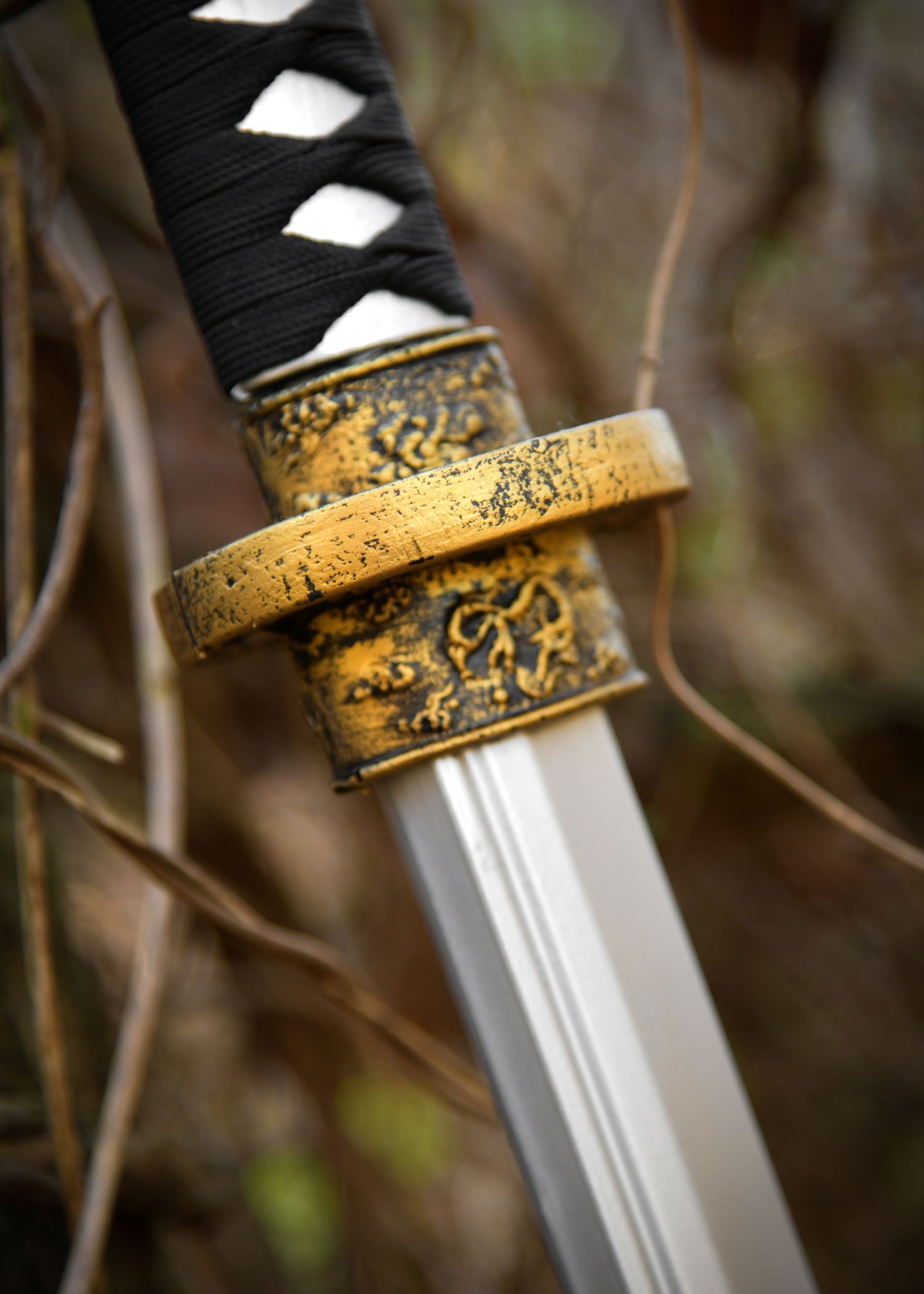 The silver handle, known as the tsuka, features a traditional ito wrapping made from real rope to ensure a secure grip, even during prolonged battles. The tsuba and kashira are adorned with subtle ornaments and finished in elegant antique gold, lending the sword an authentic appearance.